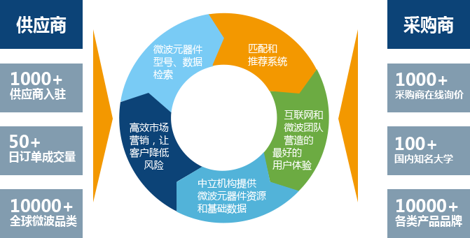 "微波超市"致力于成为全球最大的微波元器件电商综合服务平台,使全球微波产品交易变的透明、简单、高效。在传统的微波行业中,由于射频、微波产品技术门槛较高,行业上下游信息不够对称、不够透明,行业资源配置效率不够高, 有很大的改进空间。"微波超市"致力于利用互联网技术打造一个射频微波行业的产品、人力资源及行业自媒体的综合服务平台。通过优化资源配置,更高效的服务于行业客户。"微波超市"将利用平台的力量,破除行业旧体制的种种弊端,建立全新的行业服务机制,实现更大的社会价值。经过半年多的迅猛发展,现已经有数百家全球采购商和供应商入驻,月单额超五百万元人民币并持续稳定增长。同时,我们收录了上百家产品数据及供应商数据,致力于为您提供最方便快捷的使用体验。
