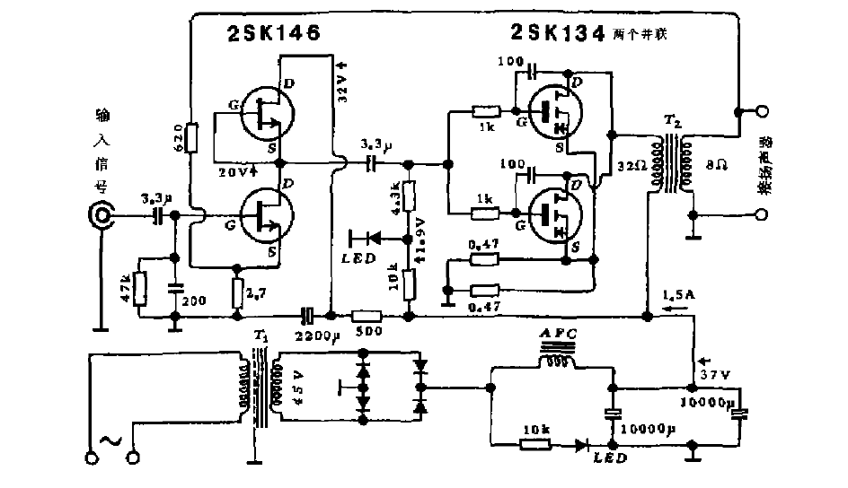 很多音响爱好者都对电子管WE300B甲类功率放大器的音质赞不绝口,前几年东瀛的音响界曾流行过采用场效应管2SK134制作的甲类功率放大器,音色酷似WE300B,一时好评如潮,喜欢动手者竞相仿制,蔚然成风。图2则示出WE300B组成的功放电路作为参考。2SK134是一个金属壳封装的大功率场效应三极管,跟大多数同类型产品恰恰相反的是其外壳为源极,焊装时宜留意,切勿搞错;2SK146则是塑料壳封装的小功率场效应双三极管,焊接时应该仔细辨认6只管脚的极性。从图里不难看出,两只2SK134呈并联状态,栅极上都有一只阻值为1KΩ的防自激电阻;输出变压器的初级阻抗为