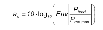 在同轴器件及以共模形式工作的带有屏蔽的对称器件上,输入功率Pfeed 与由在外部回路上的最大感应电压产生的最大散射功率Prad,max的对数比率被定义为屏蔽衰减as。由此,一段长电缆(l>λ/10)如同轴电缆的屏蔽衰减就被定义为电缆输入功率Pfeed 与最大散射功率Prad,max 的对数比率,如下公式所示: