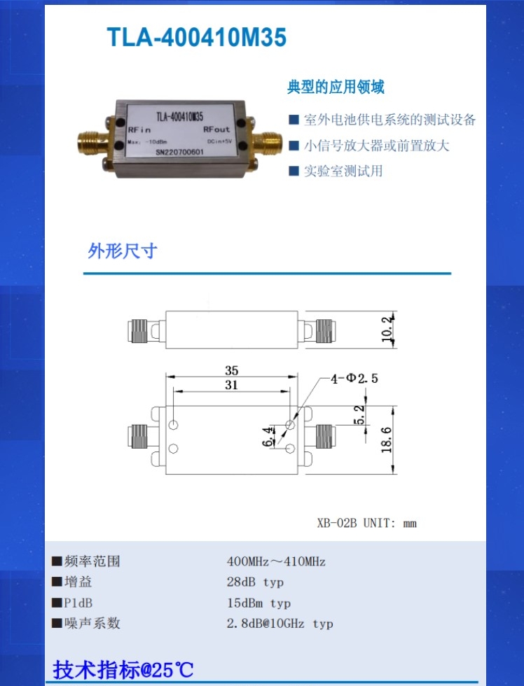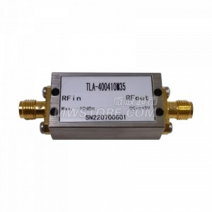低噪声放大器 频率范围:400MHz~410MHz 增益: 28dB typ P1dB: 15dBm typ 噪声系数:2.8dB@10GHz typ